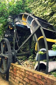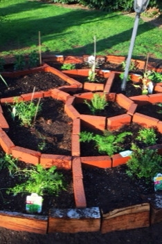 dehors in mezzo a piante ornamentali, da fiore e da frutto.