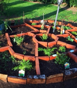dehors in mezzo a piante ornamentali, da fiore e da frutto.